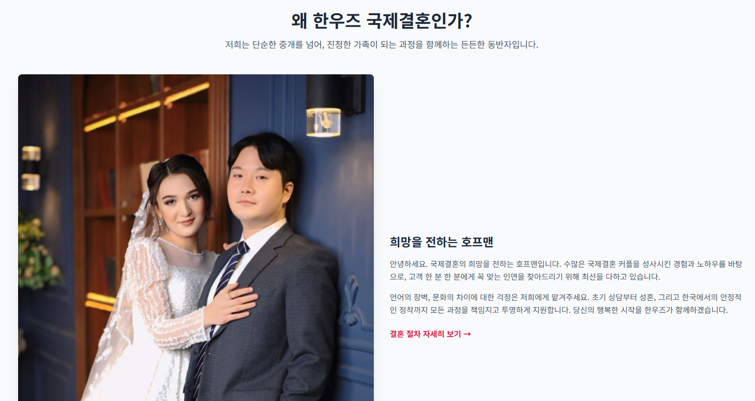 - → 한우즈는 이러한 분들에게 맞춤형 상담부터 결혼 이후의 적응까지 함께하는 파트너입니다.
